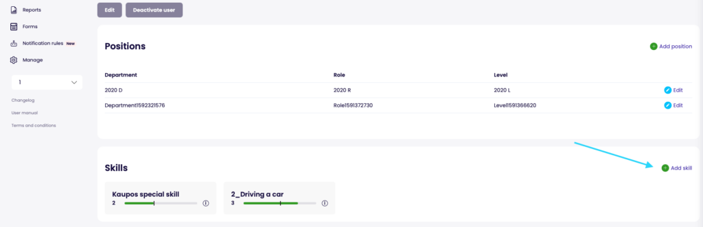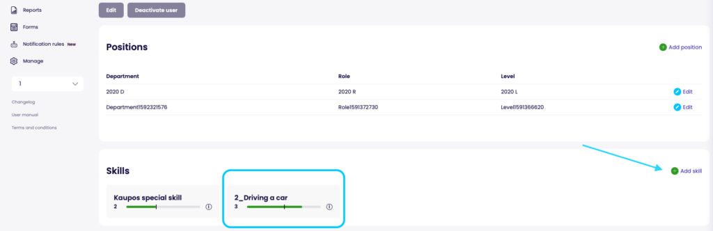 Navigation path: Navigate to “Employees” and select a specific user. Then you will find the skills section in the user card