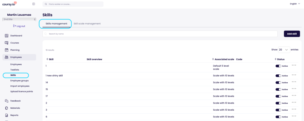 - NB!! Deleting skills is possible even when the skills are connected to users/courses so be EXTRA careful when deleting something!