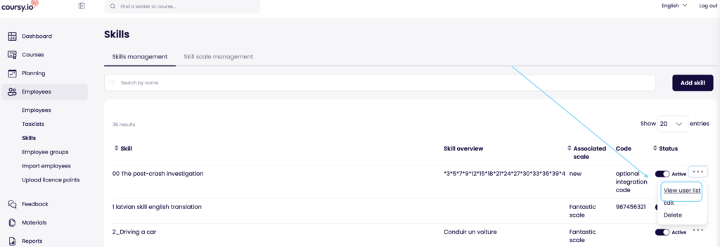 Navigation path: Navigate to “Employees” -> “Skills” and select the skill you want to see users that have the skill applied for. Then select the “three dot” menu and “View user list” option