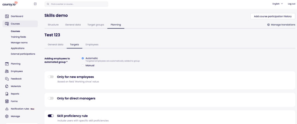 Once the rule has been enabled and configured then users are added to the automated planning group based on their skill proficiency levels. Please note that course target group settings also apply so make sure those are also on par with what you desire.